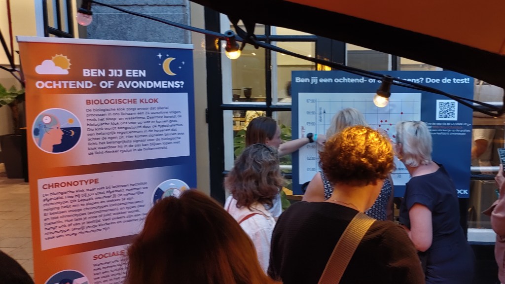 On a beautiful Saturday night we were at the Nacht van Ontdekkingen, a science and art festival in the Hortus botanicus in Leiden, representing the BioClock consortium. More than 200 visitors did a short chronotype test to find out if they are an early bird or night owl and added their result to the graph to see how they compare to other people. More info on the BioClock website.